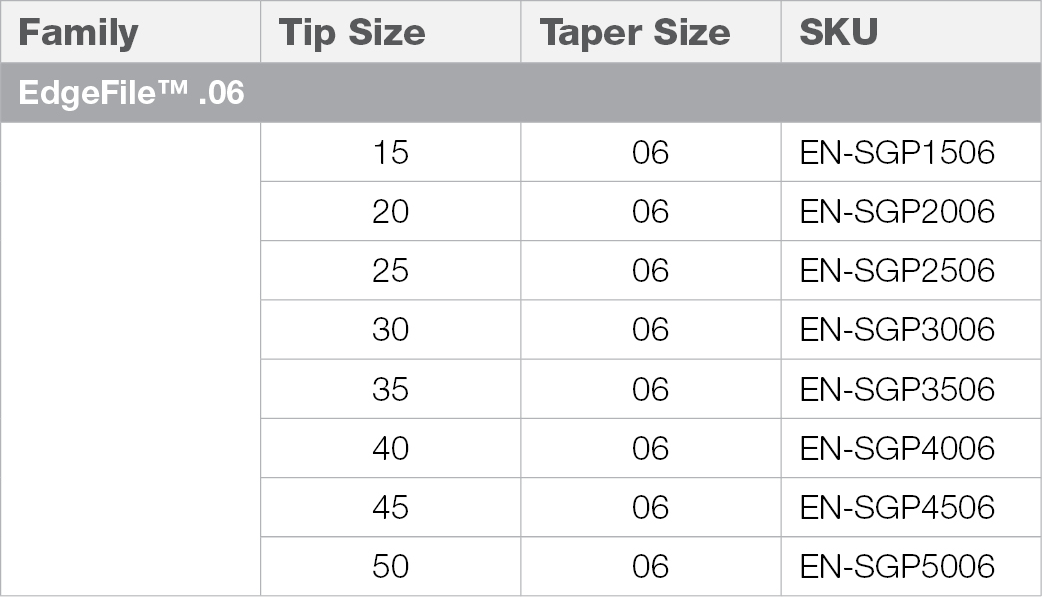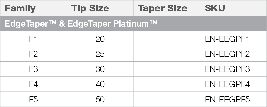 Our EdgeSequel™ points come in all the standard sizes, from 15 to 50 in .04 and .06 taper and are standard length 29mm +/-1.